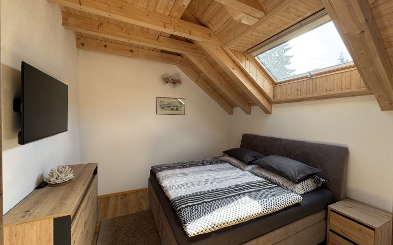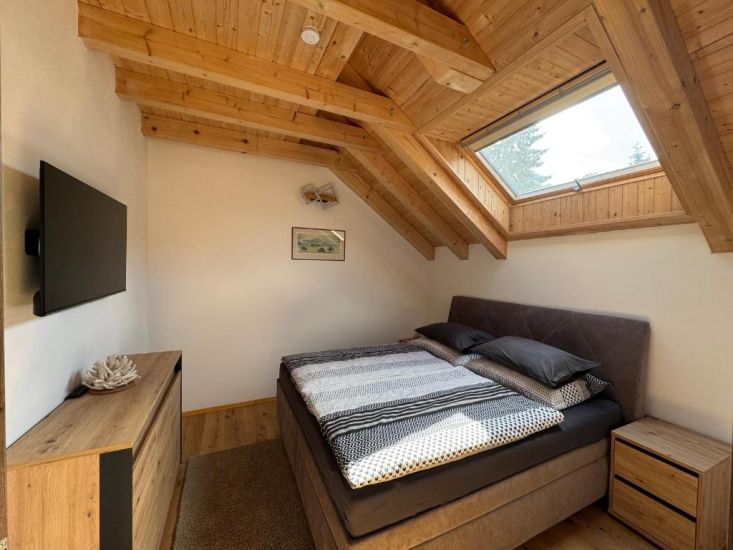 Velká místnost pro 2 - 4 osoby, s manželskou postelí a rozkládací pohovkou. Pohovka plní plnohodnotné dvoulůžko. Součástí místnosti je plně vybaven kuchyňský kout - lednice, trouba, myčka, indukční varná deska, mikrovlnná trouba, rychlovarná konvice.